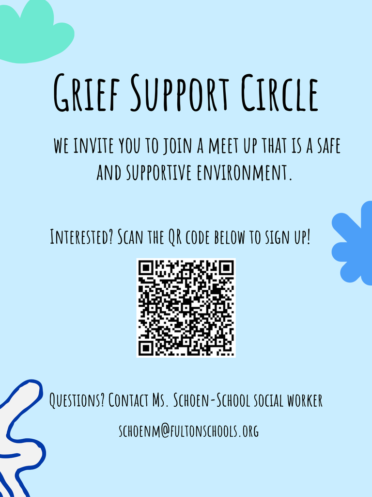 Grief Support Circle - Holidays can be tough when grieving. Whether it’s from the loss of a loved one, incarceration, deportation, chronic illness, moving away, or military active duty, we invite you to come and connect with other students who understand. Share your story in a safe place, or simply be present to find support and healing. Please join us for the Grief Support Circle by the NY Life Foundation next Thursday during the Flex period. If you are interested, RSVP through the QR code or with JCHS School Social Worker Ms. Schoen schoenm@fultonschools.org.